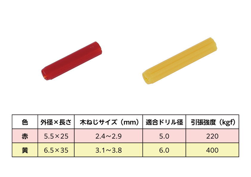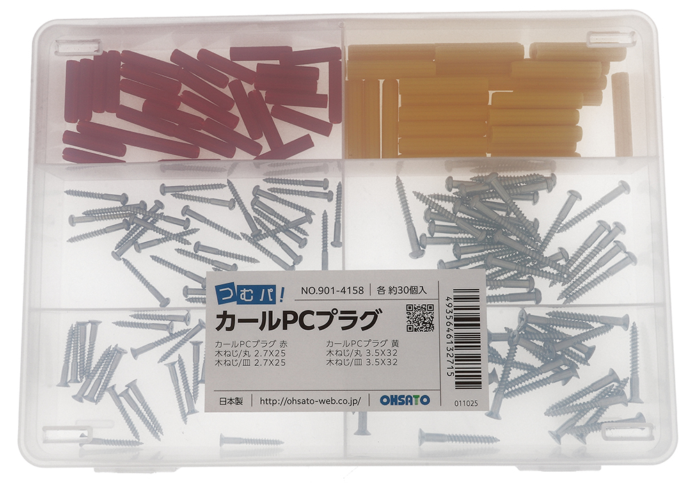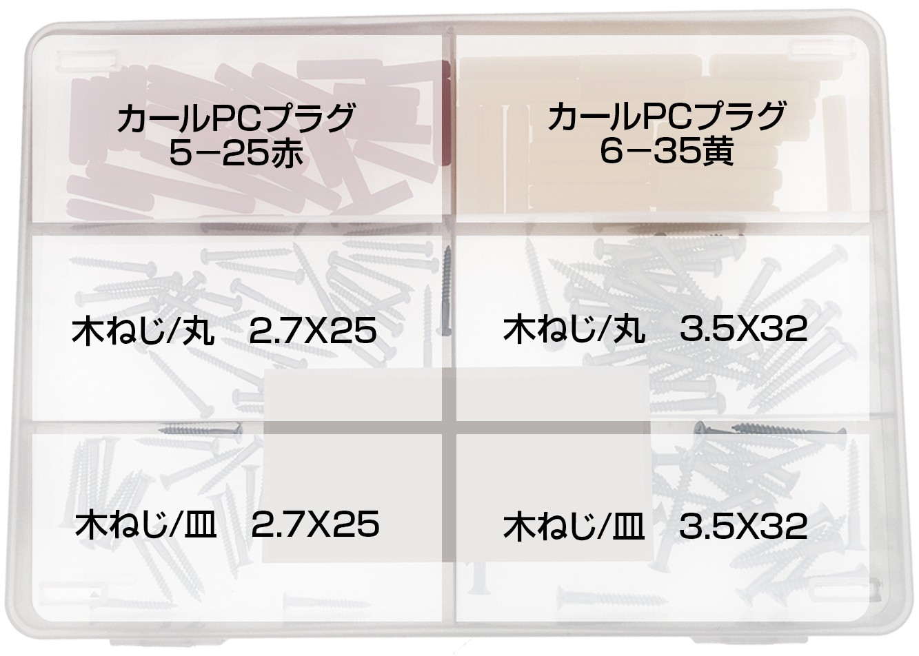 つむパ!シリーズ【カールPCプラグ赤・黄】 商品特徴 コンクリート、ブロック、タイル面等の軽量物取付工事に。軟質のプラスチック製で軽く、錆びず、割れません。 内容詳細 ・カールPCプラグ 赤 5×25・カールPCプラグ 青 6×35・ユニクロ木ねじ/丸 2.7×25・ユニクロ木ねじ/丸 3.5×32・ユニクロ木ねじ/皿 2.7×25・ユニクロ木ねじ/皿 3.5×32 各 約30個入