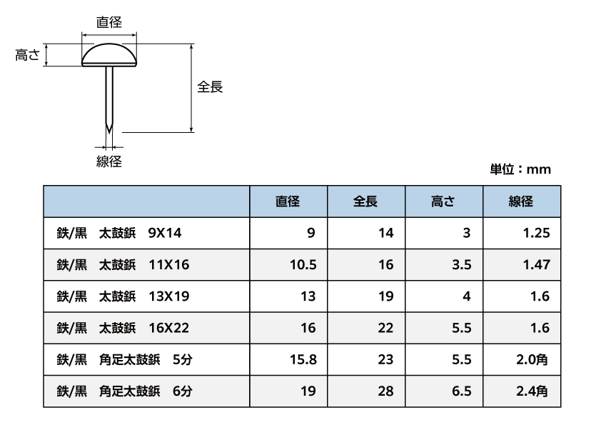 ・鉄/黒 角足太鼓鋲 5分