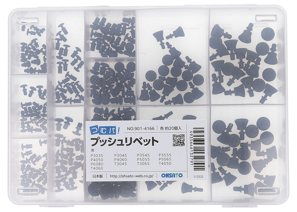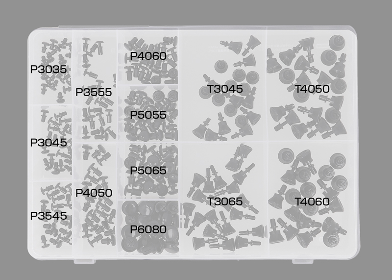 つむパ!シリーズ【プッシュリベット / 黒】 商品特徴 Pタイプ:リベットの頭部を押し込むことで脚が開き、薄板などを締結します。Tタイプ:指で簡単に締結・取り外しが行えるリベットです。 内容詳細 材質:6ナイロンカラー:黒 ・Pタイプ 3035・Pタイプ 3045・Pタイプ 3545・Pタイプ 3555・Pタイプ 4050 ・Pタイプ 4060・Pタイプ 5055・Pタイプ 5065・Pタイプ 6080・Tタイプ 3045 ・Tタイプ 3065・Tタイプ 4050・Tタイプ 4060 各 約20個入